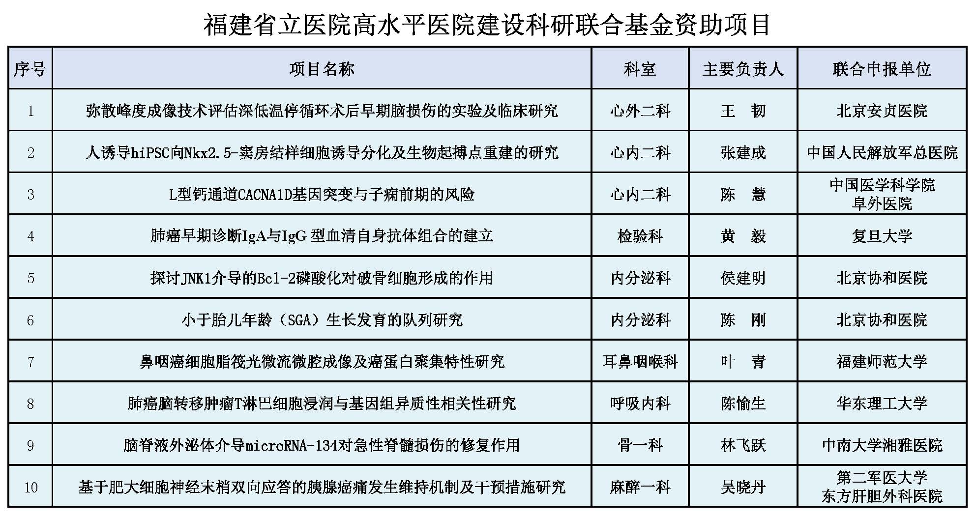 日前,经院内外专家多轮评审,10个中标项目揭晓,涵盖心外科、心血管病、内分泌与代谢病、耳鼻咽喉科、呼吸病、骨科、麻醉、实验诊断等学科,每个项目资助50万元。