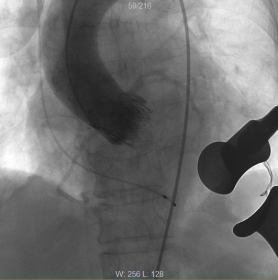 术后再次造影检查,见人工主动脉瓣位置良好,瓣口返流消失