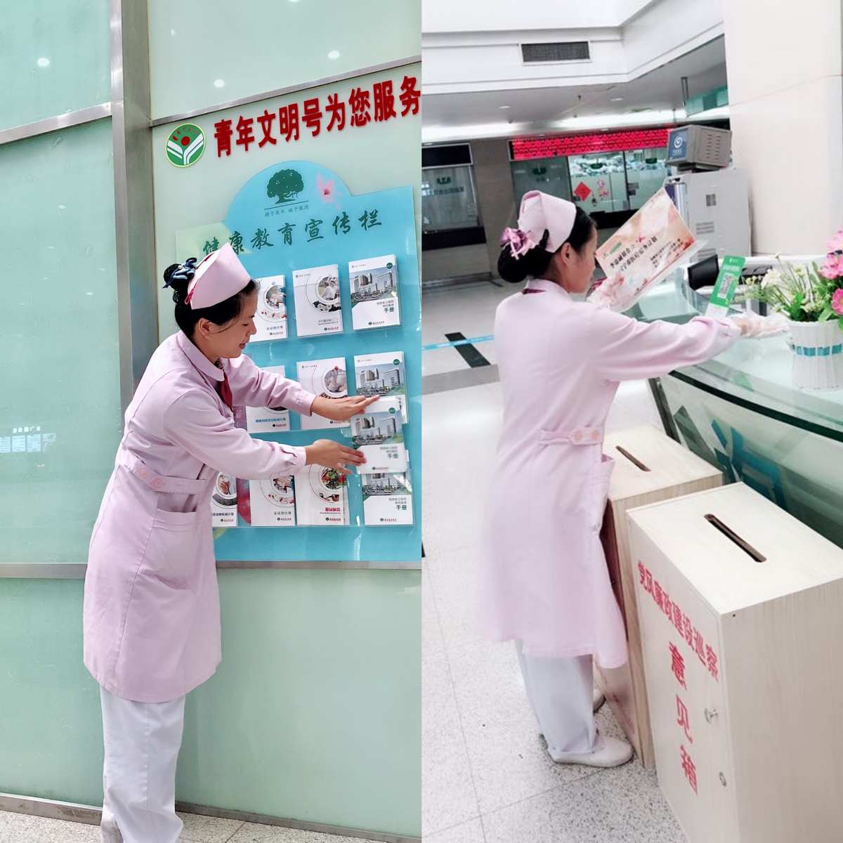 ▲导诊护士一大早就开始准备开诊前各项事宜:整理健康宣传栏资料及清洁服务台。