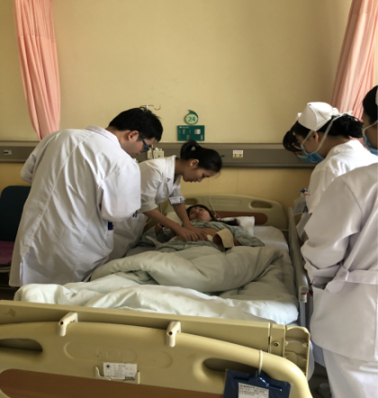 ▲假日里,实习同学们跟着老师认真学习穿刺技术,也许在这样的日子里,她们放弃聚会能学到更多。