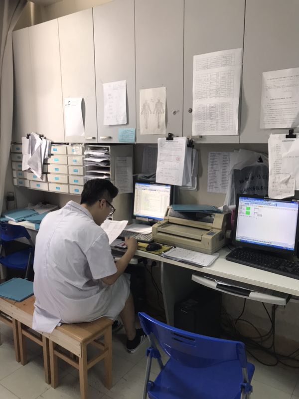 ▲19区值班医生认真查阅病历,为每一位患者调整治疗方案。