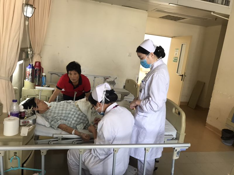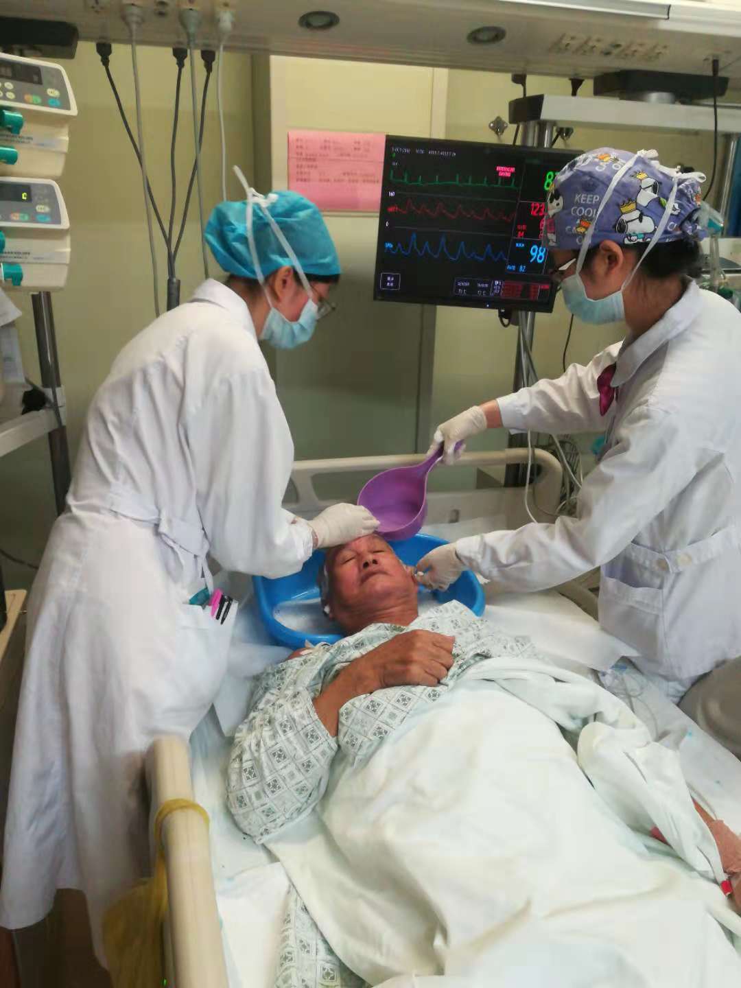 ▲36区重症医学四科护士们在做晚间护理,为危重症患者洗头、吹发。