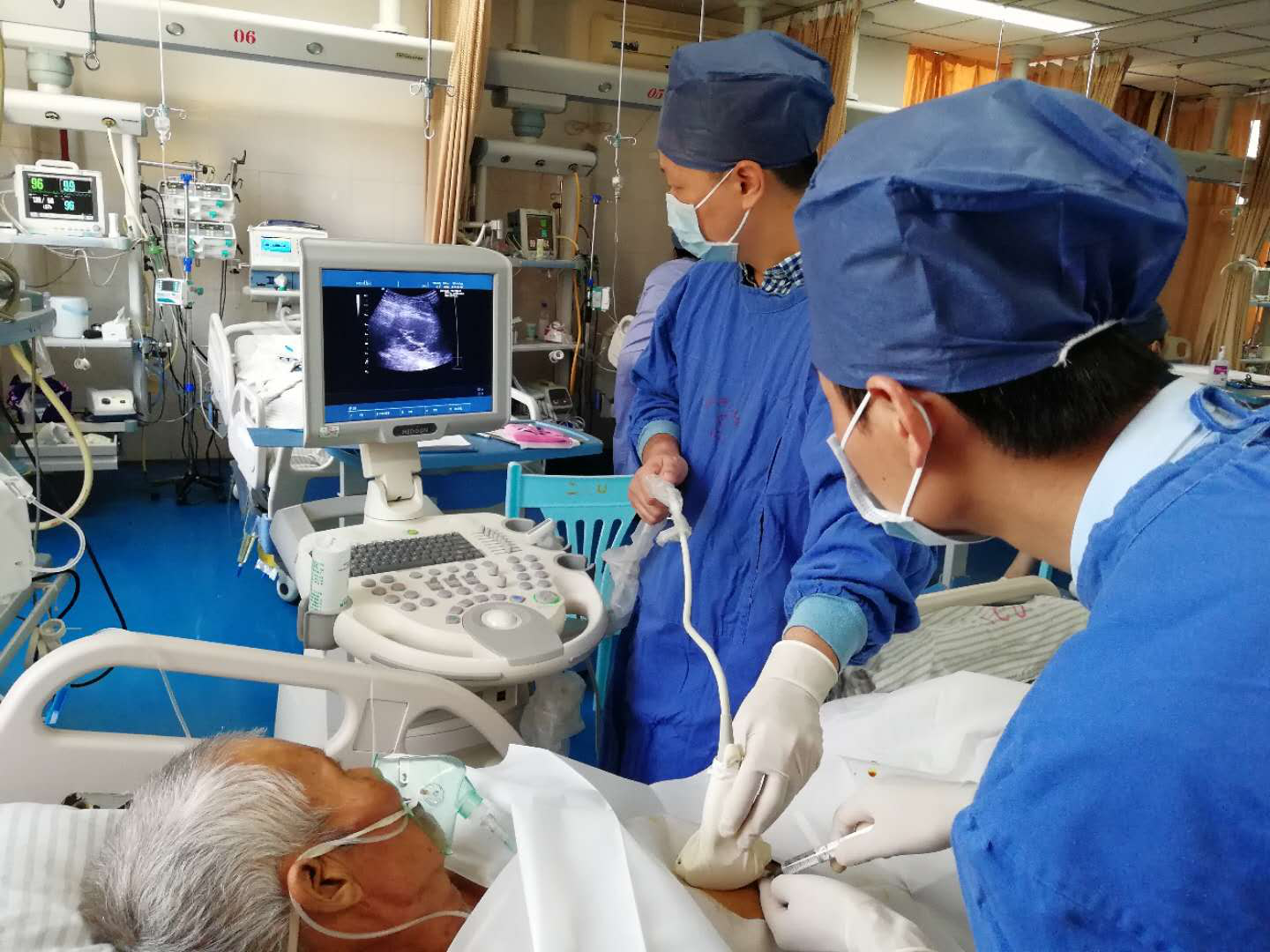 医疗队队员在开展B超引导下腹腔穿刺引流