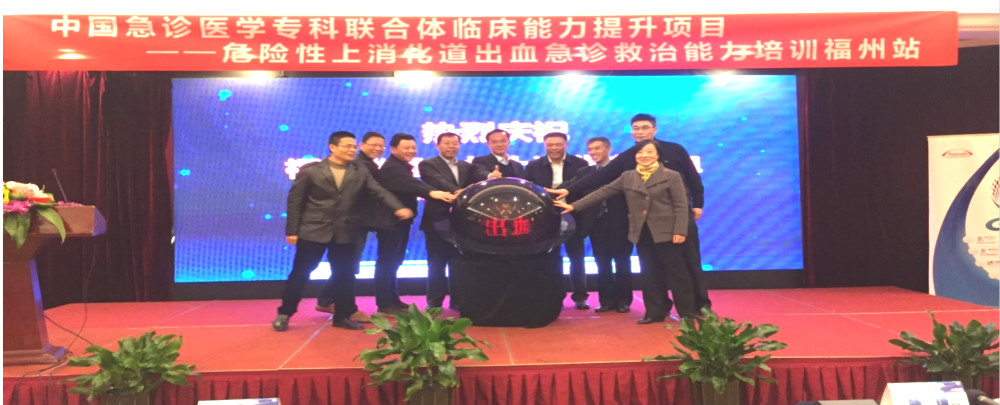 于学忠教授、陈锋教授、赵晓东教授、周荣斌教授、福建省急救中心副主任郑晓春教授、我院医务部林孟波主任、院前急救部王晓萍主任、福建医大附一医院急诊科主任林志鸿教授、解放军联勤保障部队第九00医院急诊科主任张伟教授一起点亮彩球,正式启动福建省危险性上消化道出血急诊救治快速通道项目。