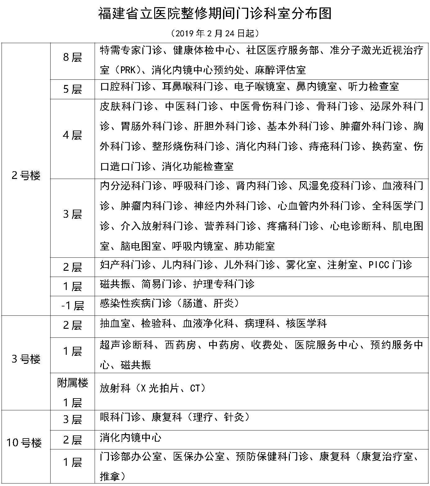 经过紧张施工,福建省立医院门诊楼(2号楼)内部整修一期工程已全部完成,该楼二层至五层将于2月24日(星期日)启用。启用后的楼层分布及相关门诊科室分布如下图。