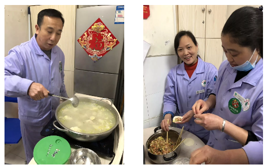 医院后勤保障的员工们包起饺子来。