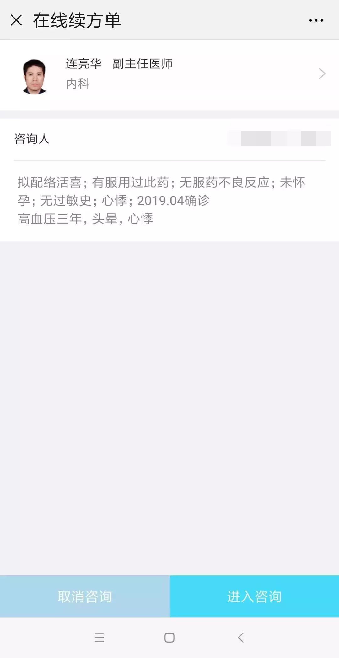 在医生主页截面中选择“在线续方”,并根据自身情况进行阐述。
