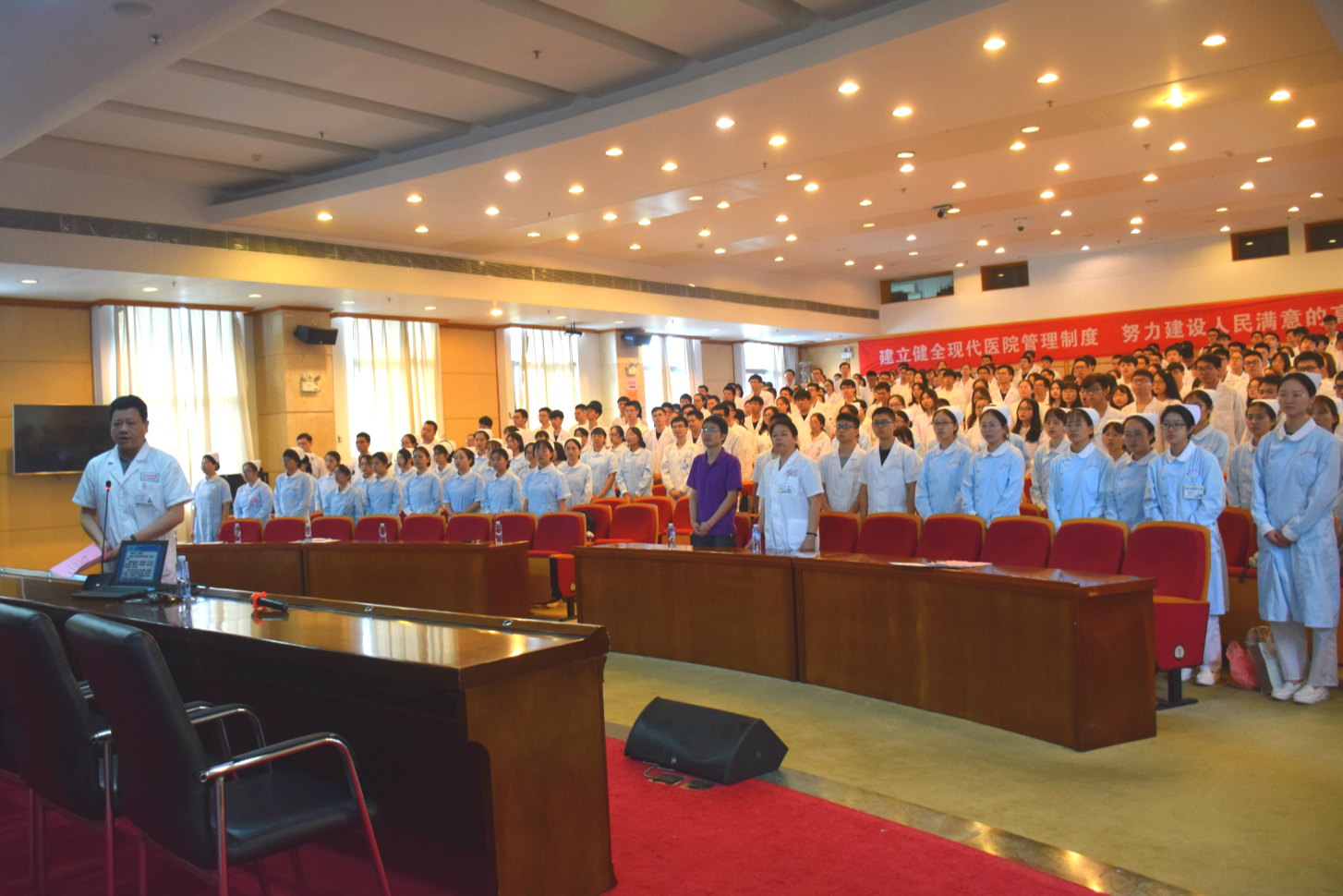 党委书记、院长朱鹏立教授以“省立文化与从医之路”为题,给实习生们讲授了岗前培训第一课。朱院长介绍了省立医疗体系承载的社会责任,通过几个小故事,勉励同学们要多一份坚守、多一些关爱、多一点责任。籍由医院宣传片《传承》、《阳光微笑》,引导实习生们不忘初心、传承仁爱,努力将行医、工作、做学问融入生活常态,守护健康,成为合格的医者,照顾好每一位病人。