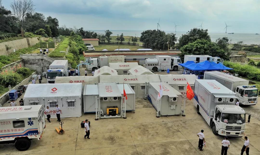 从福建省立医院出发的国家紧急医学救援队(福建)75人以及13辆应急救援特种车组成的移动方舱医院,经由轮渡登陆南日岛,直抵“灾区”,快速进行方舱医院搭建,开展救援工作。