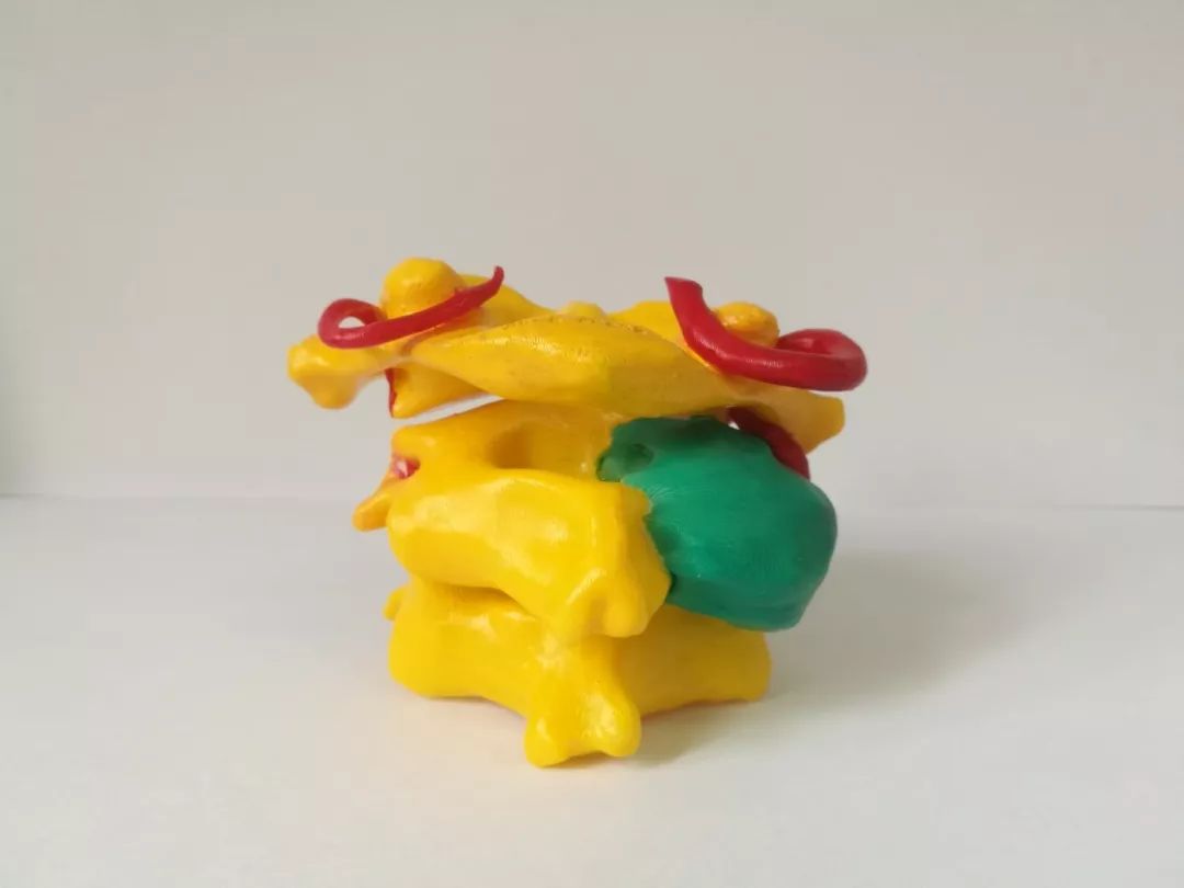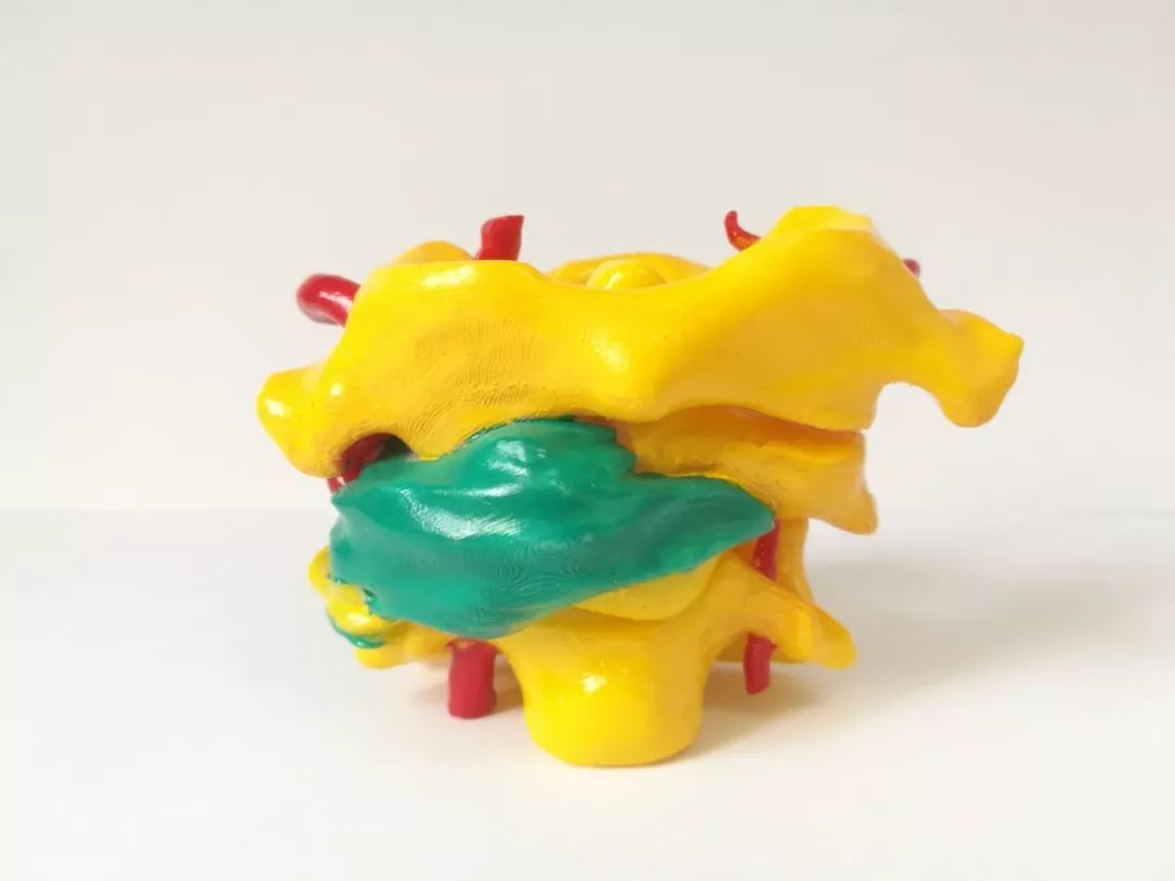 患者小陈(化名)半月前因不慎摔倒造成后颈部剧烈疼痛,连颈部的活动受限,检查发现他的颈部除椎体骨折外,椎动脉也被肿瘤组织包绕,导致颈椎稳定性丧失,需要手术治疗。同时,小陈还患有合并扩张型心肌病、心力衰竭,左心室射血分数仅为32%。经过骨科、心内科、麻醉科等专家的综合评估,一致认为患者心脏条件差、肿瘤部位高且血供丰富,手术难度大,手术风险极高。为术中能快速、精准地切除肿瘤,重建脊柱稳定性,徐杰教授团队决定利用3D打印技术重建脊柱、肿瘤及血管结构,并对肿瘤及其周围组织的关系作仔细评估,并制定了完善的手术方案。