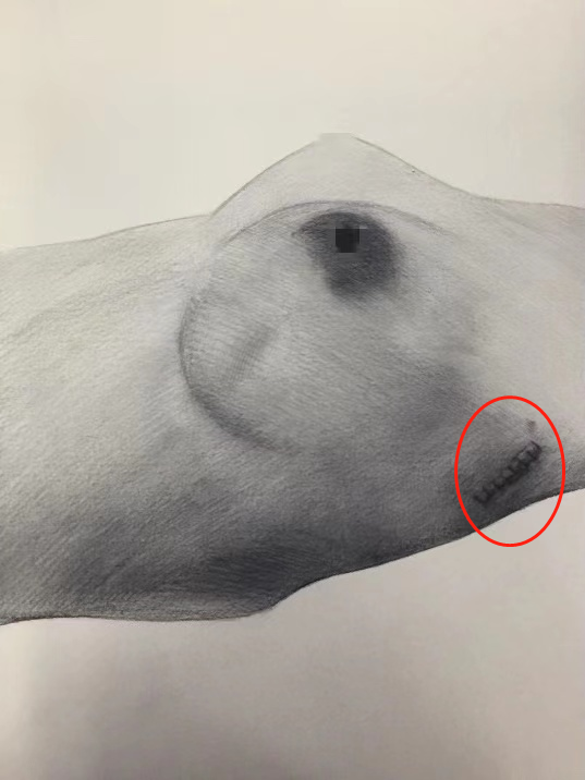 ▲经腋窝单孔腔镜乳房切除+再造术,全乳无瘢痕,腋窝75px切口,恢复后瘢痕隐蔽,不易发现。