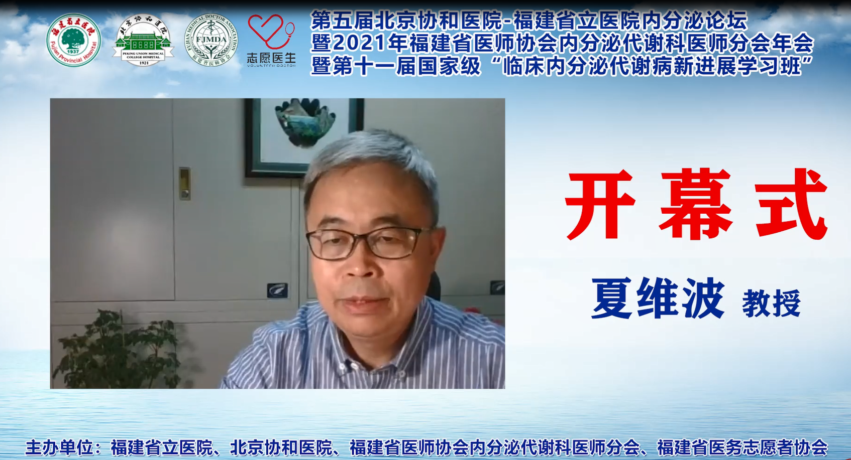 院领导郑晓春教授代表主办单位对全国内分泌同道对我省内分泌代谢病领域发展提供的支持和帮助表示感谢,对与会专家之高端、研讨议题之热度表示充分肯定,他希望各位与会同道珍惜这次特殊时期难能可贵的学习机会,将学术探讨和思想碰撞相结合,踊跃交流、满载而归。中华医学会骨质疏松和骨矿盐疾病分会前任主任委员、北京协和医院内分泌科主任夏维波教授代表北京协和医院发来大会寄语,他回顾了五年来双方为共建发展作出的巨大努力,在相互学习中共同提高了专科诊治水平,相信本次会议也将取得良好的效果,并希望共同将北京协和医院——福建省立医院内分泌论坛建设成为全国内分泌同道定期交流对话和表达观点的高层次平台。论坛开幕式由福建省医师协会内分泌代谢科分会会长、福建省立医院内分泌科主任侯建明教授主持。