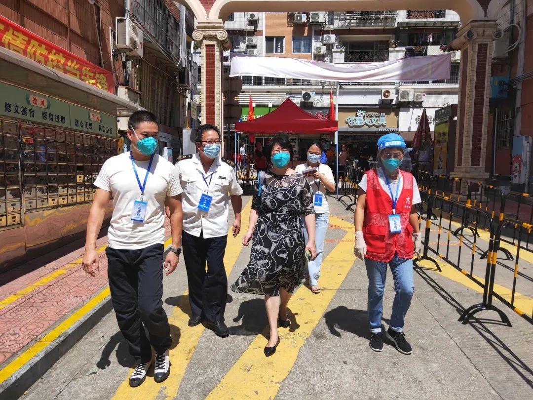 ▲林璇(前排左三)带领院感督导组在厦门市海沧医院发热门诊、厦港街道下沃社区核酸采样点等处督导