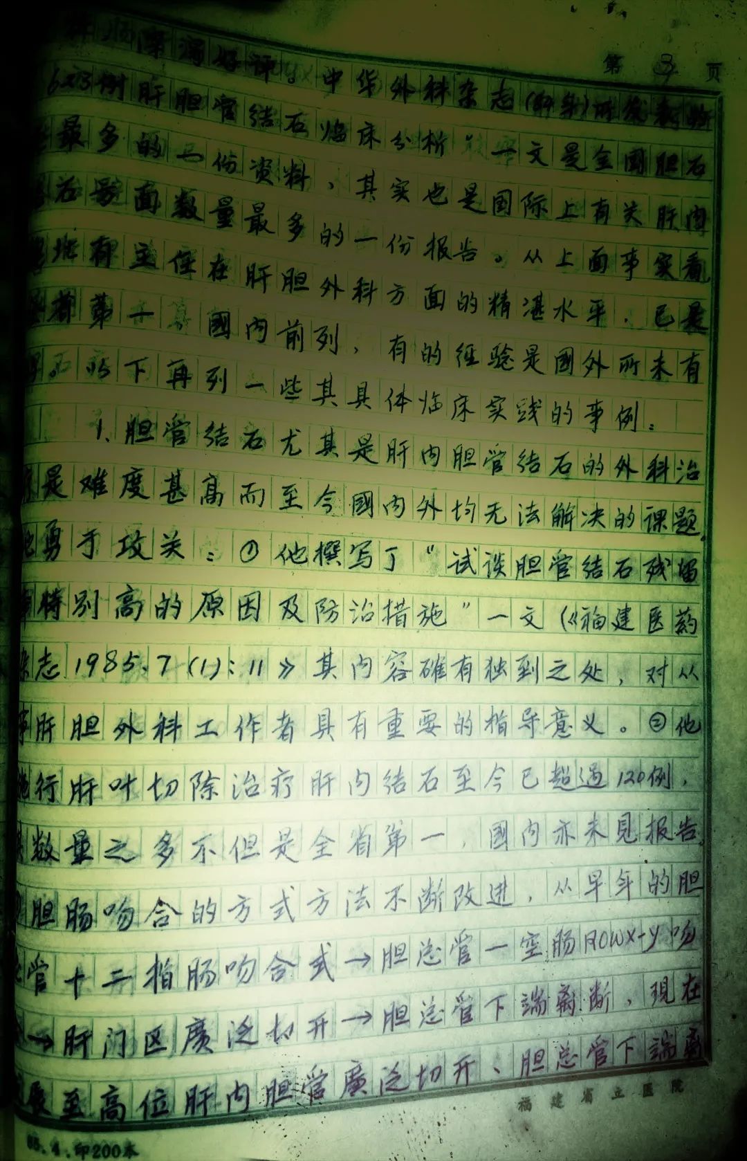精湛医术的背后是无数个不舍昼夜的坚守。积累了大量手术实践的基础,他的技术水平在国内同行业中已名列前茅,学术成果广受关注。1984年,中华外科杂志发表了他的《623例肝胆管结石临床分析》,是当时全国胆石症最多的一份资料,导师裘法祖了解到他的胆道手术已达1500台,亲自推荐他参加全国第一届普外科学术会议。他成为当时在全国肝胆症研究协作组里唯一的福建代表。