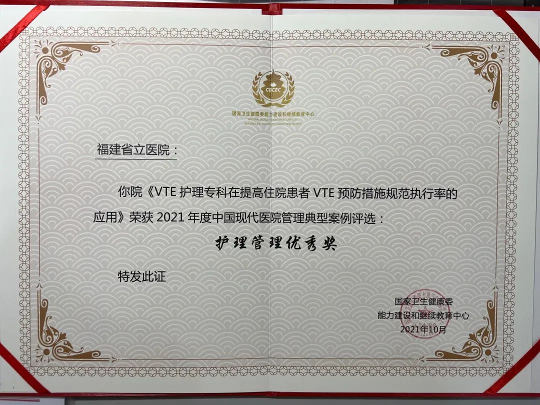 另外,我院《“智”者达,“专”者精——集采药品的常态化管控》《VTE护理专科在提高住院患者VTE预防措施规范执行率的应用》两个项目还获得由国家卫生健康委能力建设和继续教育中心主办的中国现代医院管理典型案例评选医院药事管理、护理管理优秀奖。