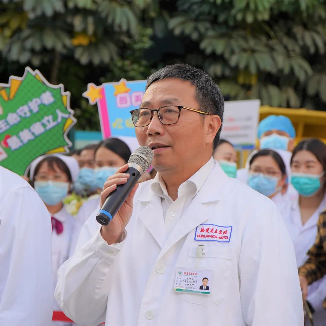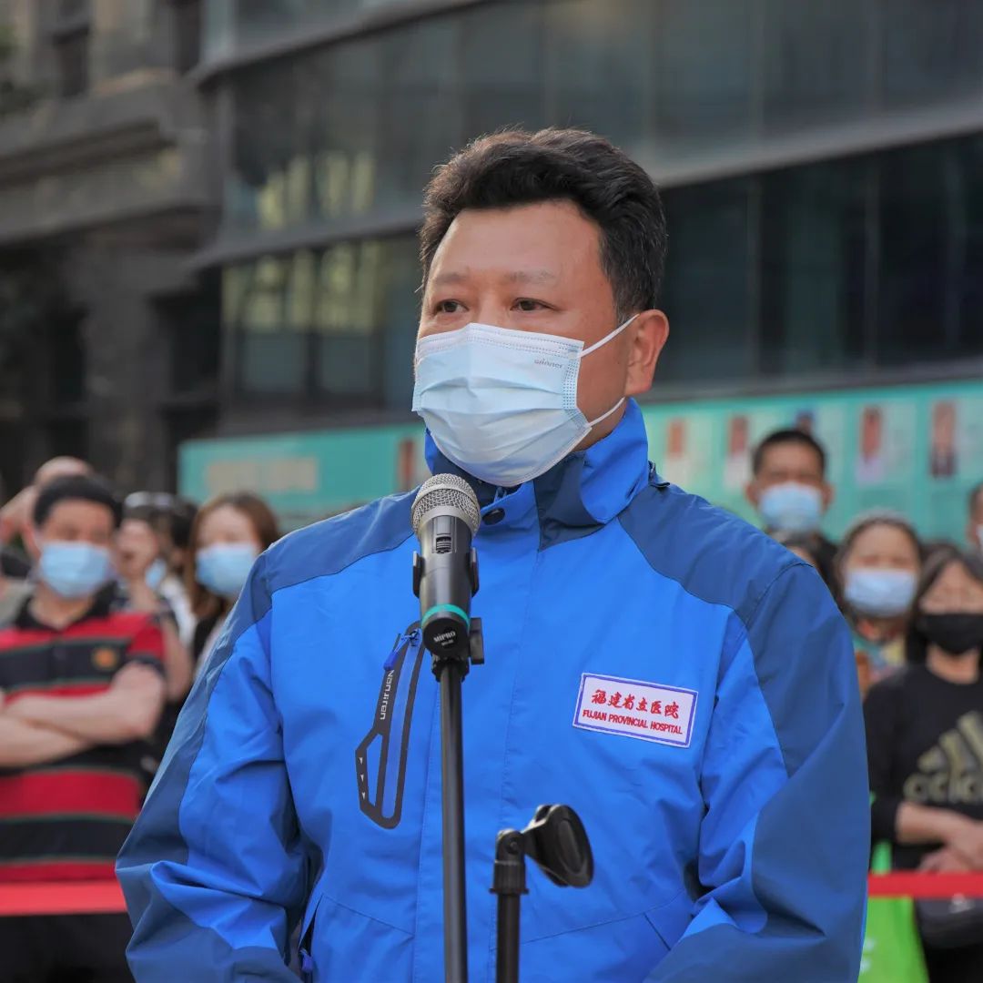 党委书记、院长朱鹏立代表全体省立人向队员致以崇高的敬意,向默默支持队员的家人们表示衷心的感谢。他说,站在医院这个熟悉的广场,站在庄严的五星红旗下,心情是高兴、钦佩和期望。高兴的是,45位同事穿越春夏,历经风雨,在省委省政府、省卫健委坚强的领导下,出色的完成了泉州、宁德的各项抗疫任务,再次彰显了省立人在危急时刻海纳百川的包容、万众一心的团结、挺身而出的担当;钦佩的是队员克服重重困难,在两年多抗疫实践中创造的许多第一:第一次建立省级联合检测方舱中心,指导并参与建设省内第一家方舱医院,指导所在地定点医院、隔离病房的规范改造和医疗救治工作,在短时间内总结了一系列可供借鉴交流的抗疫经验,制定了一系列高效可操作的工作机制,完善了一系列科学的规章制度,用精益求精的专业精神再次为福建省抗疫贡献省立力量;期望的是你们要继续发扬伟大抗疫精神,不断践行“精于医术,诚于医德”的院训,用你们在抗疫中所提炼出来的作风,所展示出的战斗力投入到今后日常工作中去。