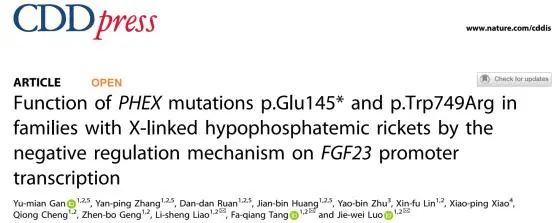 课题组研究生甘玉棉在CELL DEATH DIS(中科院1区/JCR1区,IF=9.685)发表《Function of PHEX mutations p.Glu145* and p.Trp749Arg in families with X-linked hypophosphatemic rickets by the negative regulation mechanism on FGF23 promoter transcription》。