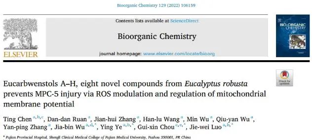课题组博士后陈颋在有机化学高水平期刊Bioorganic Chemistry (中科院1区/JCR1区),发表《Eucarbwenstols A–H, eight novel compounds from Eucalyptus robusta prevents MPC-5 injury via ROS modulation and regulation of mitochondrial membrane potential》。