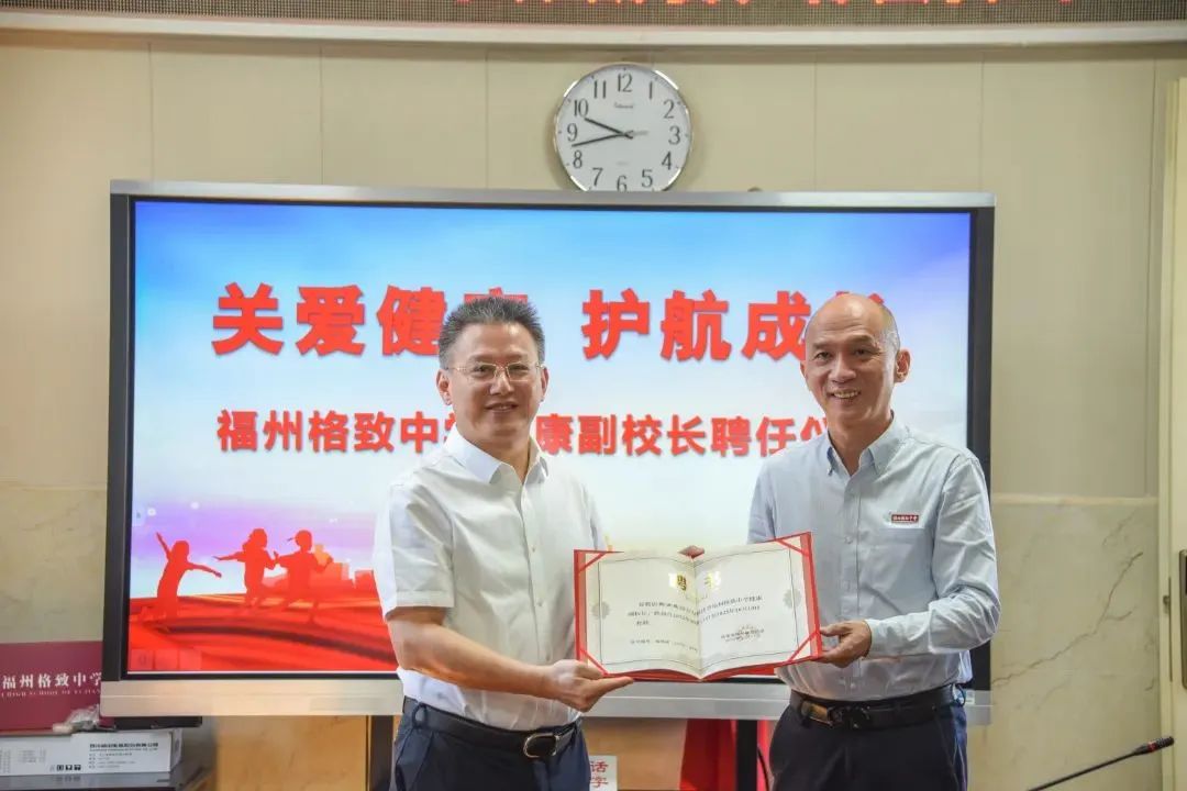 福州格致中学徐聪校长和周雪英书记为魏世超教授颁发聘任书,向团队成员赠送鲜花