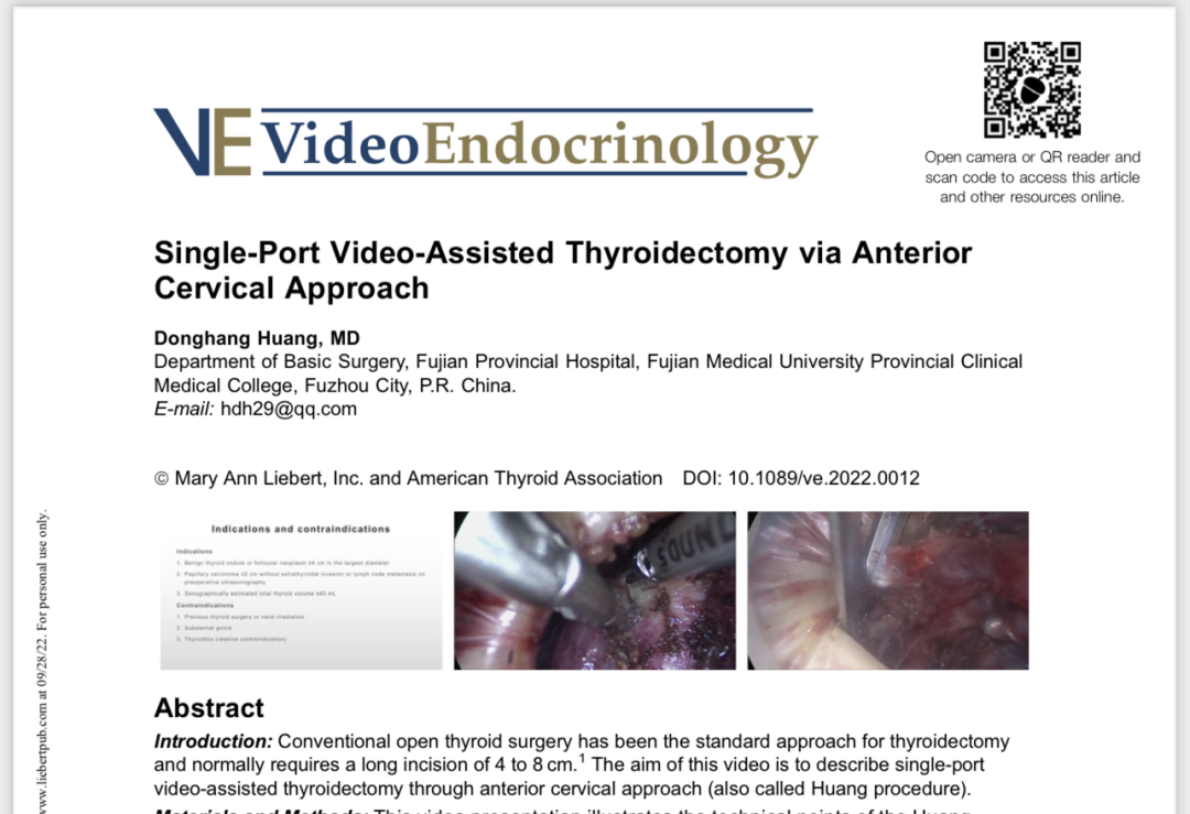 近日,我院基本外科黄东航主任医师的手术视频Single-Port Video-Assisted Thyroidectomy via Anterior Cervical Approach(颈前入路单孔腔镜辅助甲状腺手术)在美国甲状腺协会官方杂志VideoEndocrinology发表。