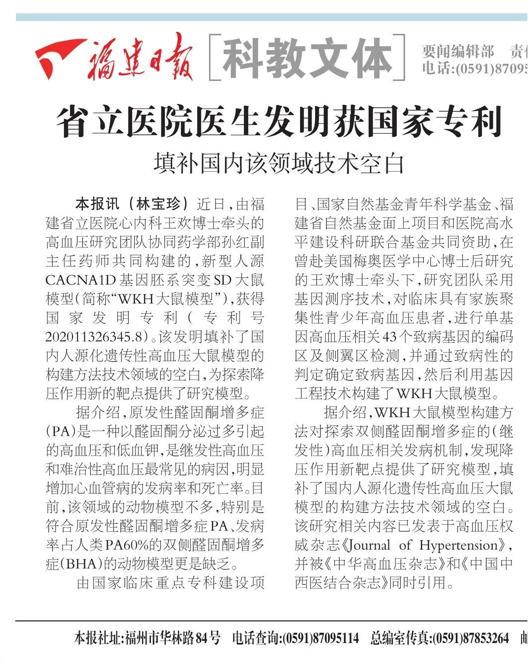 由国家临床重点专科建设项目、国家自然基金青年科学基金、福建省自然基金面上项目和医院高水平建设科研联合基金共同资助,在曾赴美国梅奥医学中心博士后研究的王欢博士牵头下,研究团队采用基因测序技术,对临床具有家族聚集性青少年高血压患者,进行单基因高血压相关43个致病基因的编码区及侧翼区检测,并通过致病性的判定确定致病基因,然后利用基因工程技术构建了WKH大鼠模型。