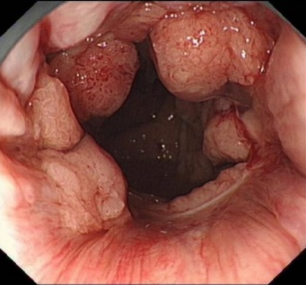 确定是罕见大面积直肠-肛管侧向发育型肿瘤——肿瘤位于肛门齿状线至距离肛门口10cm,而且环周生长,病变肛侧缘已突破肛门齿状线,病变面积大,血管丰富。