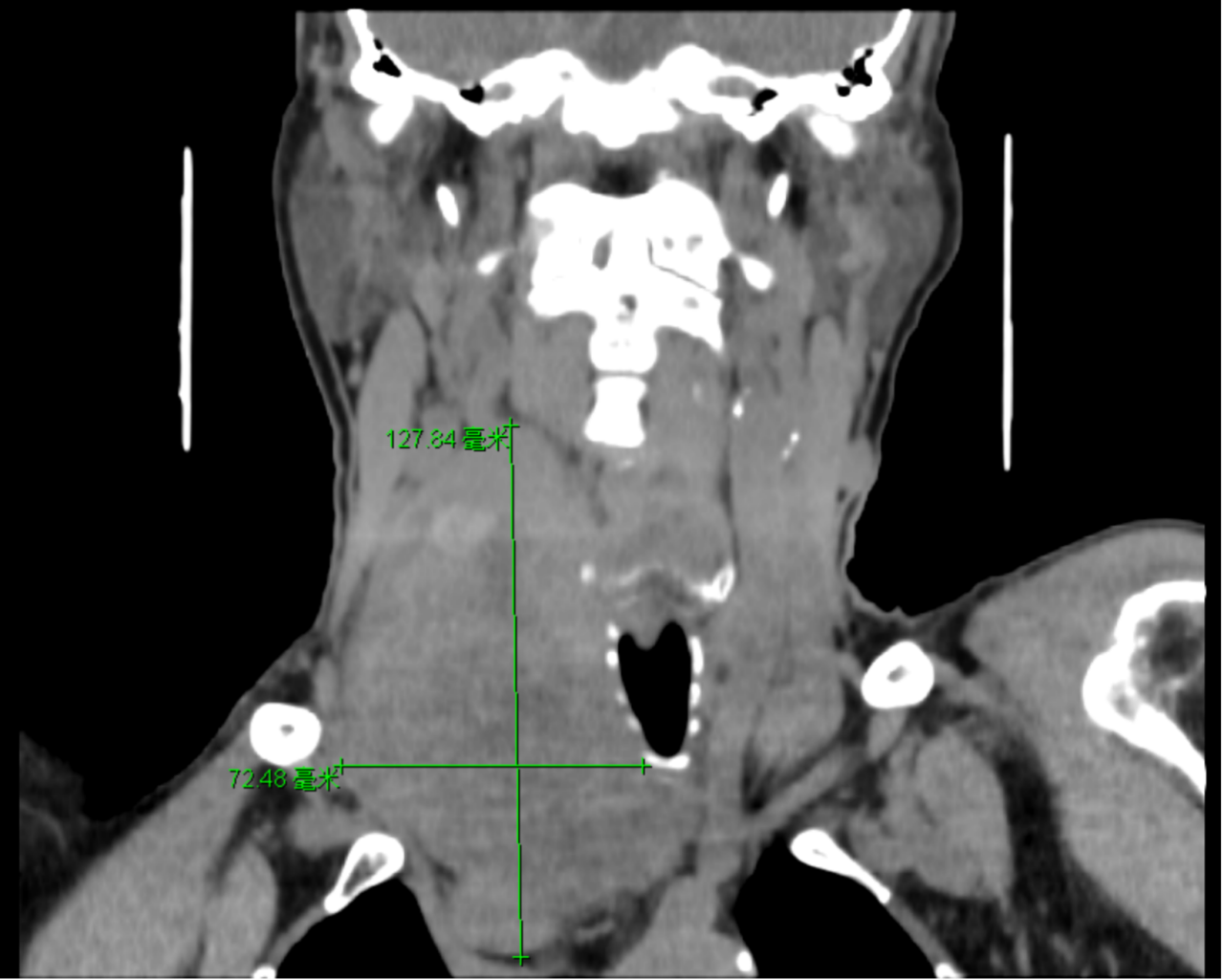 巨大甲状腺肿,一般是指最大直径超过 10 cm、质量大于 100 g 的甲状腺肿或甲状腺Ⅲ度以上肿大。这种情况往往伴随气管、颈部血管、神经等重要脏器受压偏移位,这类手术是甲状腺外科中高难度高风险的手术之一。