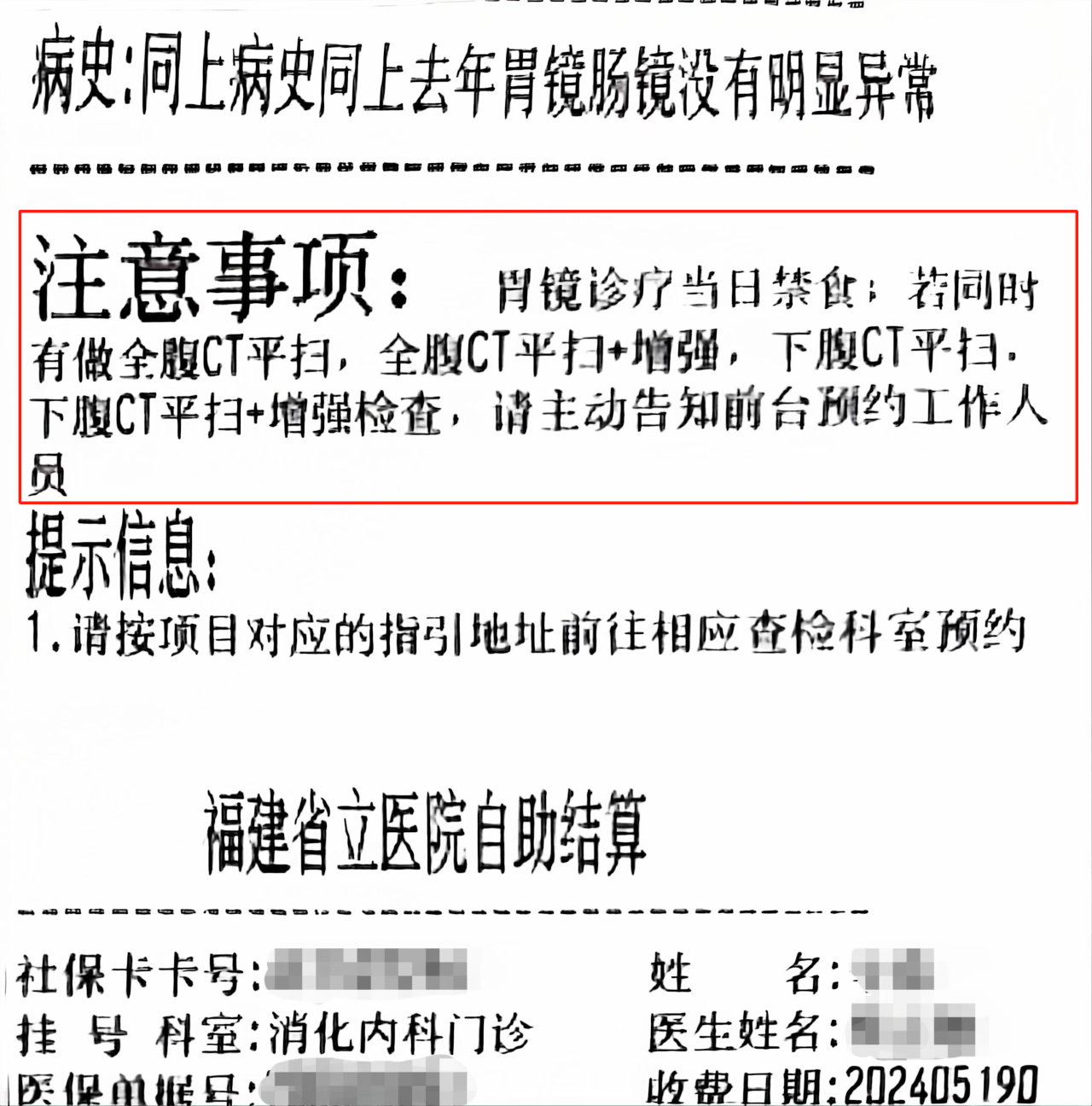 2、结算时在自助机上输出的检查预约凭条上予以提示:①若同时有做全腹CT平扫、全腹CT平扫+增强、下腹CT平扫、下腹CT平扫+增强检查,请主动告知前台预约工作人员。②若同时有做肠镜检查,请主动告知前台预约工作人员。