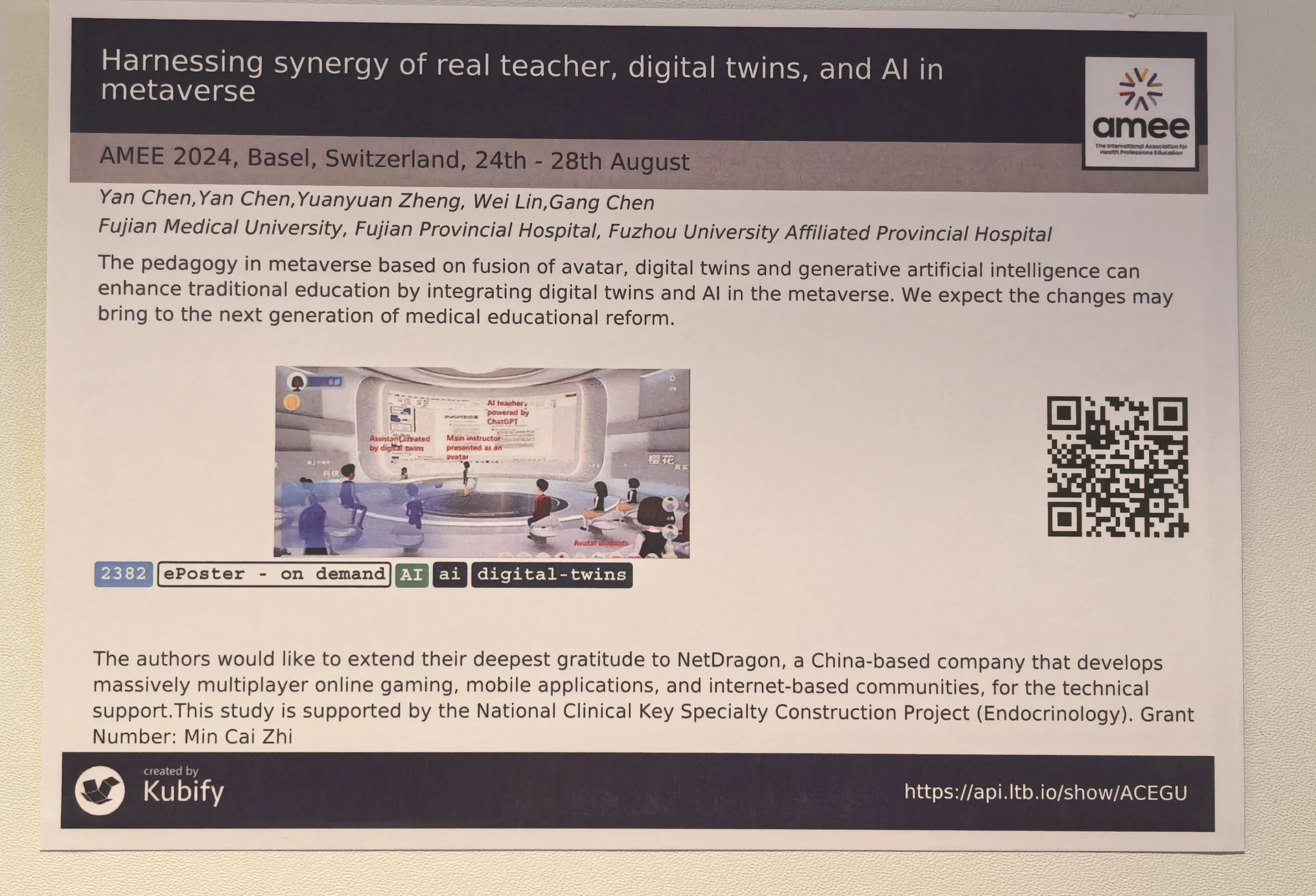 非常高兴,我们的研究成果Harnessing synergy of real teacher, digital twins, and AI in blended metaverse learning environment: a catalyst for medical education reforms(作者:陈彦、陈研、郑圆圆、林纬,通信作者:陈刚)经过层层严格筛选,入选AMEE2024电子壁报展示。