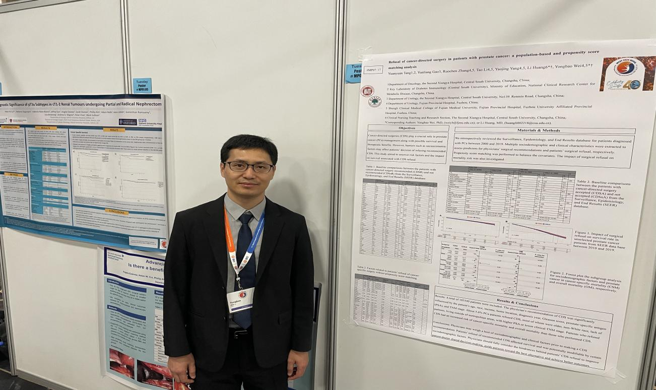 在壁报展示会场,魏永宝副主任医师分享了两项研究:支持使用内分泌治疗(ADT)与阿帕他胺联合用于新辅助治疗,以提高根治性前列腺切除术的成功率,同时未显著增加围手术期并发症;基于人群数据和倾向评分匹配分析前列腺癌患者拒绝癌症定向手术(CDS)的情况。两项研究引起现场讨论。