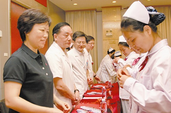 本报讯  7月13日上午,福建省立医院2013年度护理岗位新员工岗前培训结业式在学术厅隆重举行。省卫生厅党组书记、厅长朱淑芳见证了286名新护士戴上圣洁的燕尾帽和标志步入职业生涯的胸卡,寄语白衣天使要信守南丁格尔誓言,忠诚于护理事业,用心感知、主动服务,在平凡的护理岗位上建功立业。