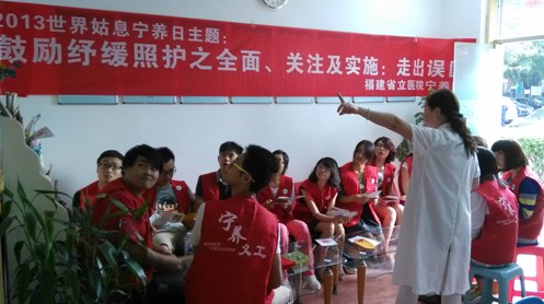 10月11日上午9:00—11:30,宁养院社工、医院义工陈先锃及福建医大人文学院社工专业15名学生义工身穿义工服在张晓芹主任指导下,将2000册宣传单发放到我院门诊大楼、肿瘤内外科病区,干部特诊病房(干部特诊一科、二科)及门诊区,同时到东街街道旗汛口社区开展宣传活动。医院也在宣传栏和电子指引板配合宣传,打出2013年世界宁养日主题:“鼓励纾缓照护之全面、关注及实施:走出误区。”吸引了前来就诊的患者。当日活动扎实有效,近2000名患者及社区居民了解了相关知识。(宁养院)