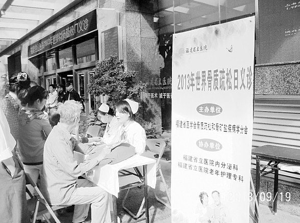 本报讯  9月19日是世界骨质疏松日,由福建省医学会骨质疏松和骨矿盐疾病学分会主办,我院内分泌科、老年护理专科协办的义诊活动在医院3号楼门前举行。干部特诊科主任医生左曼军,妇产科主任医生林婉秋,骨科主治医生罗奋棋,内分泌科主治医生蓝清华、周信伟,老年专科组长陈秋华督导、林彩萍护士长、邵庭芳护士长,成员林娟娟护士等参加义诊活动。