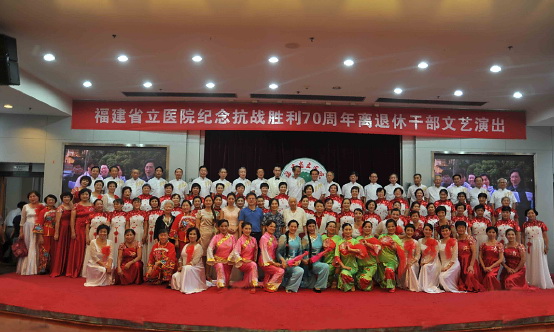8月31日下午,我院纪念抗战胜利70周年离退休老干部文艺汇演在医院国际学术厅举行,白衣老战士们共聚一堂,共同回忆那段历史。他们通过歌舞、朗诵等形式,缅怀在抗日战争中英勇献身的烈士,歌颂中国人民视死如归、宁死不屈的民族气节和不畏强暴、血战到底的英雄气概。他们倾情演出,赞歌传唱,为大家带来一场精美绝伦、流连忘返的演出。抗战老战士代表隋竹娥还登台演唱京剧《我们是工农子弟兵》,得到在场老干部们的热烈掌声,演出在《团结就是力量》的雄伟歌声中结束。此次演出得到院领导的大力支持,朱鹏立书记、副院长和魏世超副书记倾注关注和指导,省卫计委老领导唐慧如应邀到会观看指导。