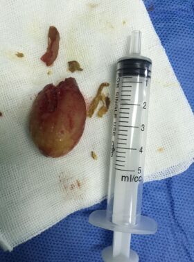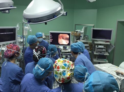 众志成城,与死神较量,直接喉镜、气管镜、视频内镜轮番上阵,不断取出异物碎片。抢救中,患者两度出现呼吸心跳停止,病情越发危重,心肺复苏后,急行气管切开,终于在右侧主支气管口取出一枚橄榄,手术成功。第一阶段抢救工作共历时7个小时,目前患者生命征平稳,转送重症医学科继续救治。