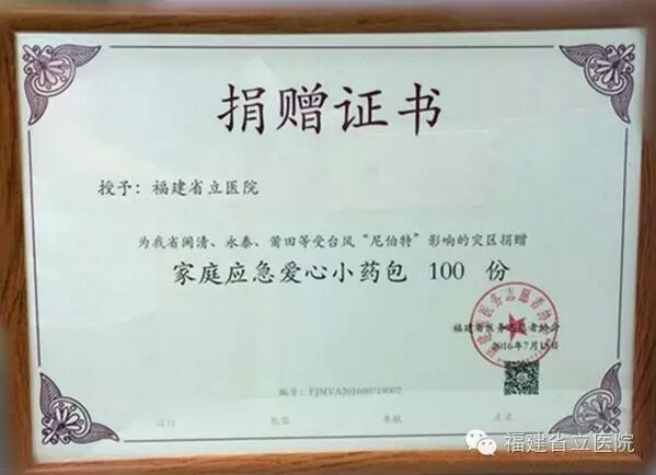 7月,闽清、永泰、莆田等地受台风“尼伯特”侵袭,受灾严重,赈灾物资短缺。一方有难,八方支援,灾情发生后,我院党委高度重视,医院先后派出4批医疗救援队弛援闽清灾区,同时积极响应福建省医务志愿者协会爱心捐赠倡议,短时间内调配齐灾区群众急需的药品等,捐赠100份家庭应急爱心小药包,为抗灾救灾献出一份爱心。